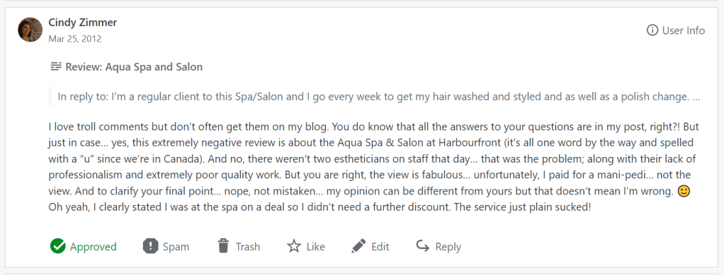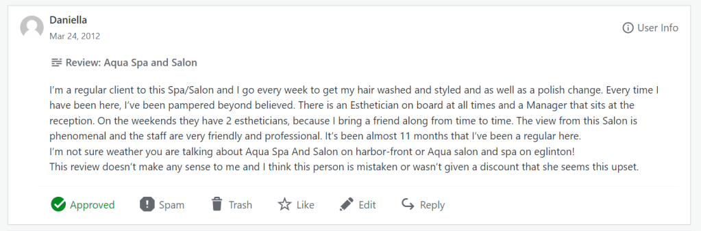 So, in my search for a great spa that does fabulous mani-pedis, my friend Mary & I visited Aqua Spa and Salon. Full disclosure: we found them through one of the deal find sites, and paid $29 for a 2 hour “spa” mani-pedi that was supposed to include “a Deluxe Manicure, a Deluxe Pedicure, Hand and Foot Massage, and a Paraffin Wax Treatment on Your Hands and Feet Exclusively from Aqua Spa and Salon ($95 Value).” When I signed up, I thought “this sounds like a place I could be a regular customer at.”
